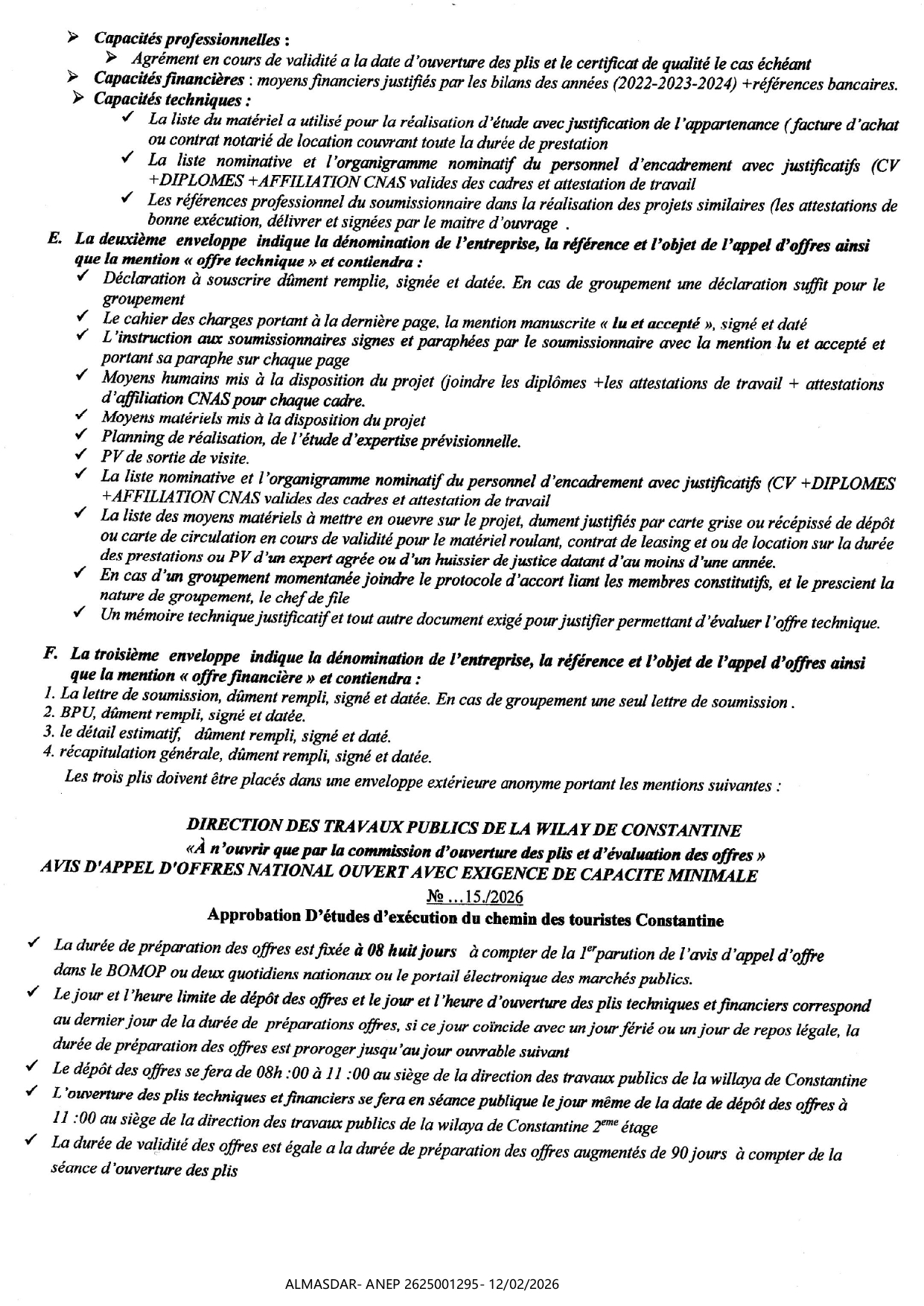 الزبون: direction des travaux publics de la wilaya de constantine رقم ANEP 2625001295 تاريخ النشر: 2026-02-12 عدد الصفحات: 1/2