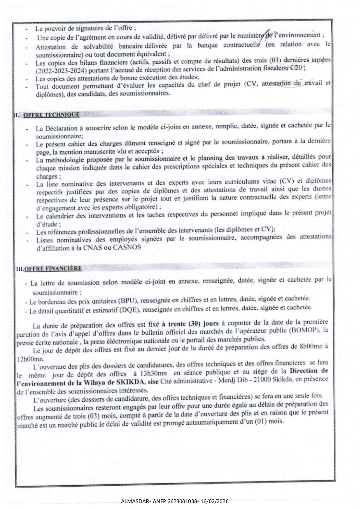 الزبون: direction de l'environnement wilaya de skikda رقم ANEP 2623001038 تاريخ النشر: 2026-02-16 عدد الصفحات: 1/2