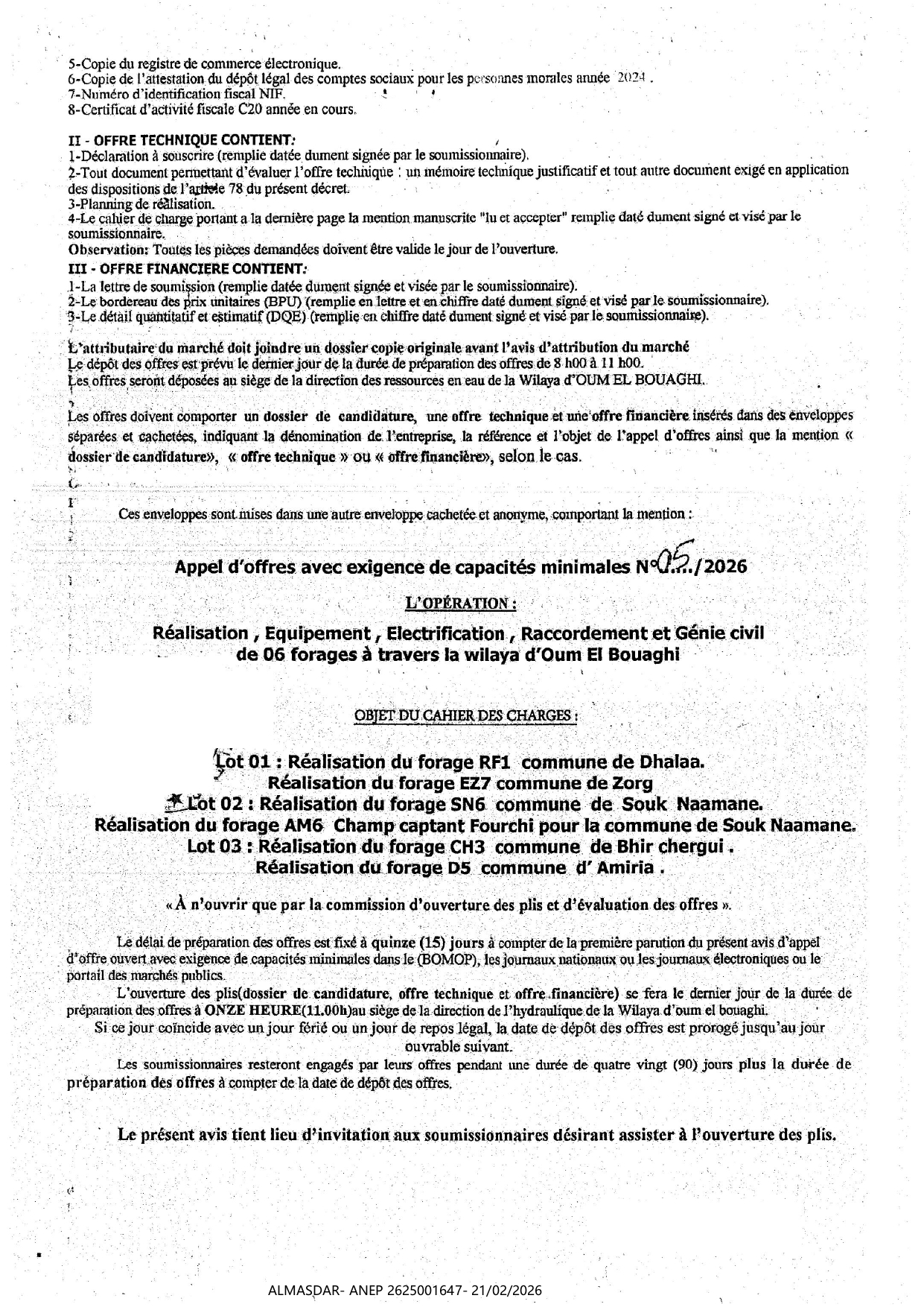 الزبون: direction de l'hydraulique wilaya de oum el boughi رقم ANEP 2625001647 تاريخ النشر: 2026-02-21 عدد الصفحات: 1/2