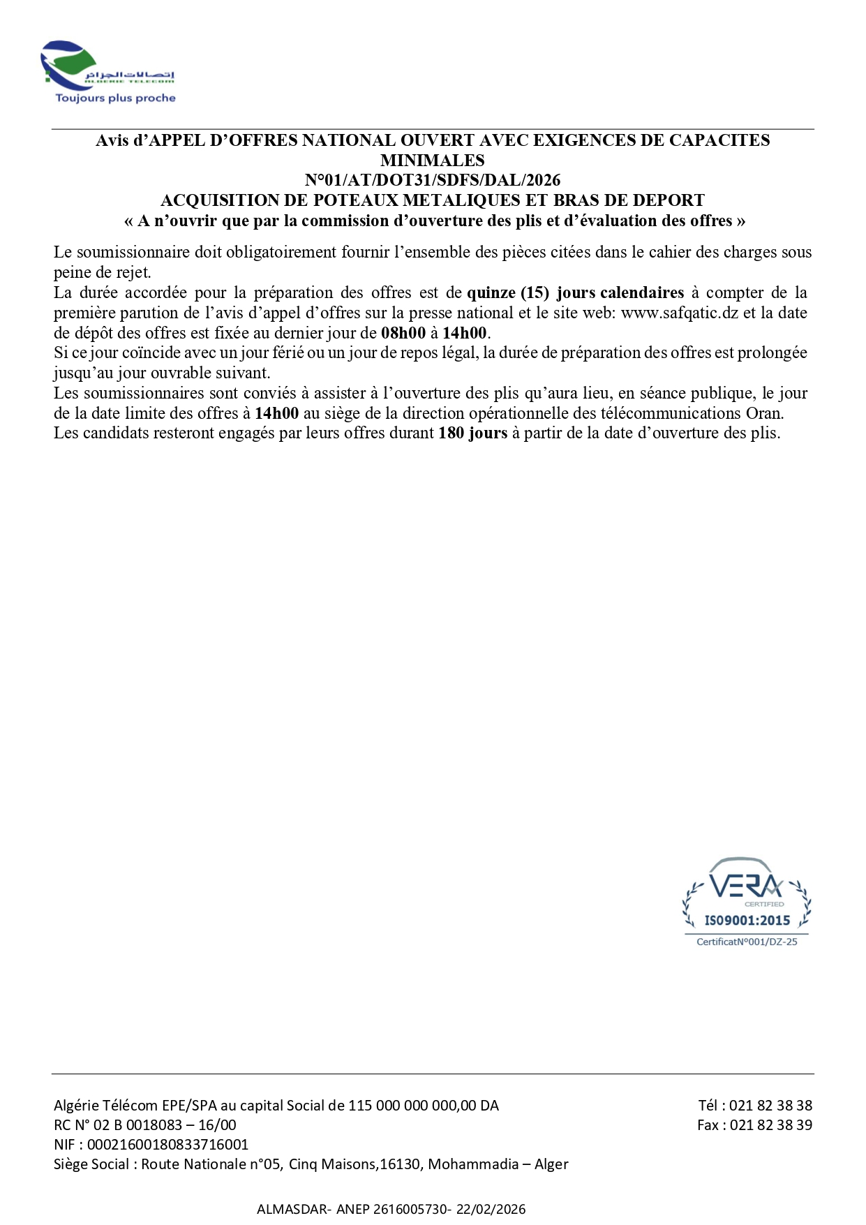 الزبون: EPE - ALGERIE TELECOM – SPA Direction Opérationnelle des télécommunications Oran رقم ANEP 2616005730 تاريخ النشر: 2026-02-22 عدد الصفحات: 1/2