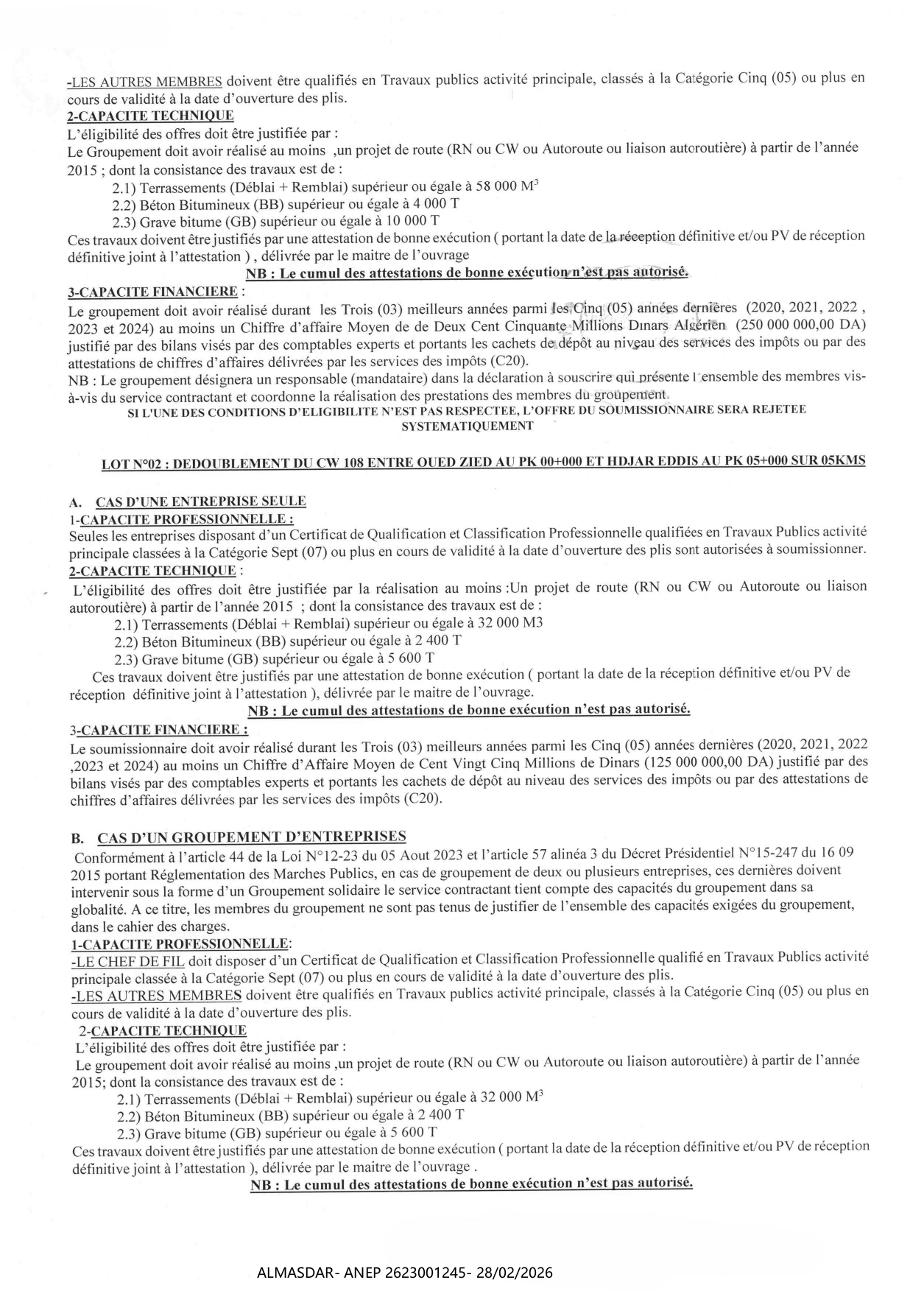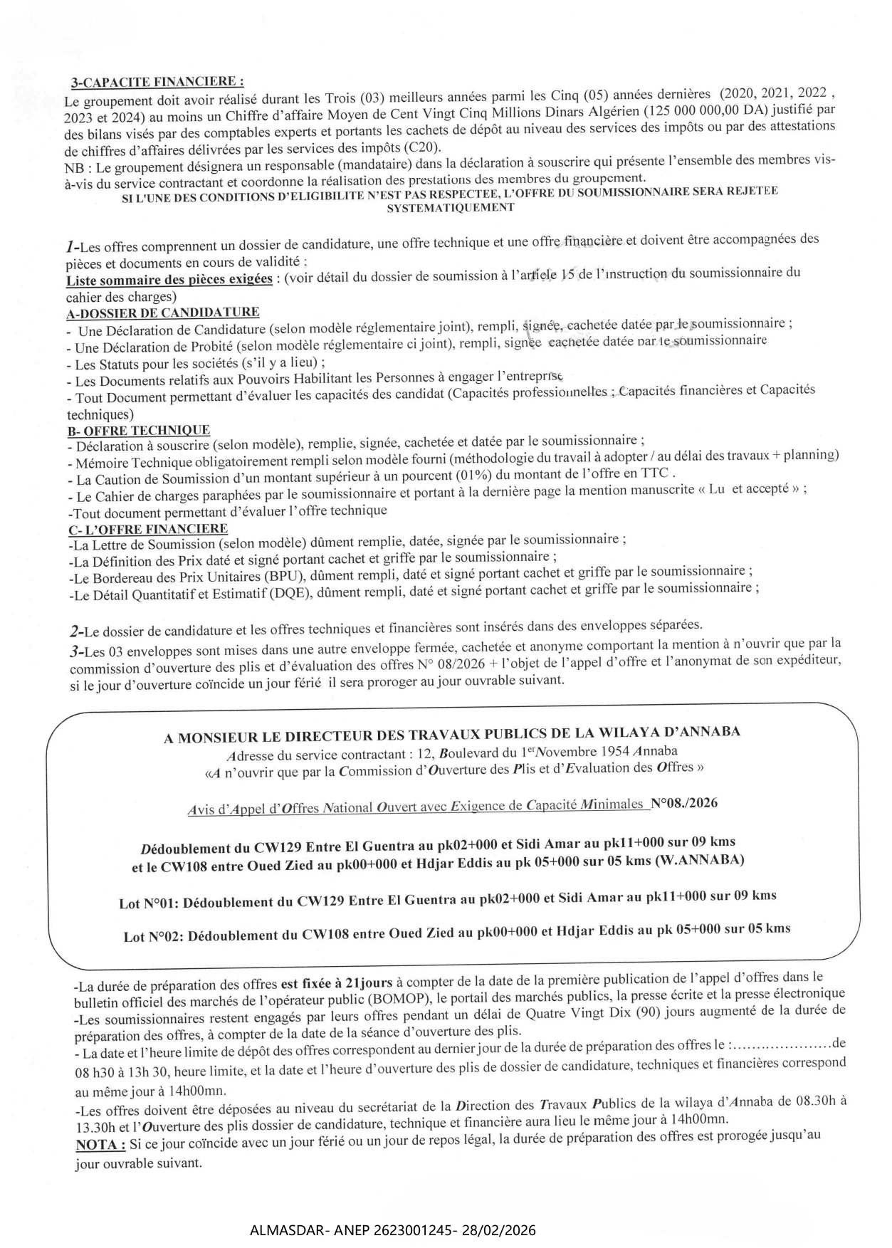 الزبون: direction des travaux publics de la wilaya de annaba رقم ANEP 2623001245 تاريخ النشر: 2026-02-28 عدد الصفحات: 3/4