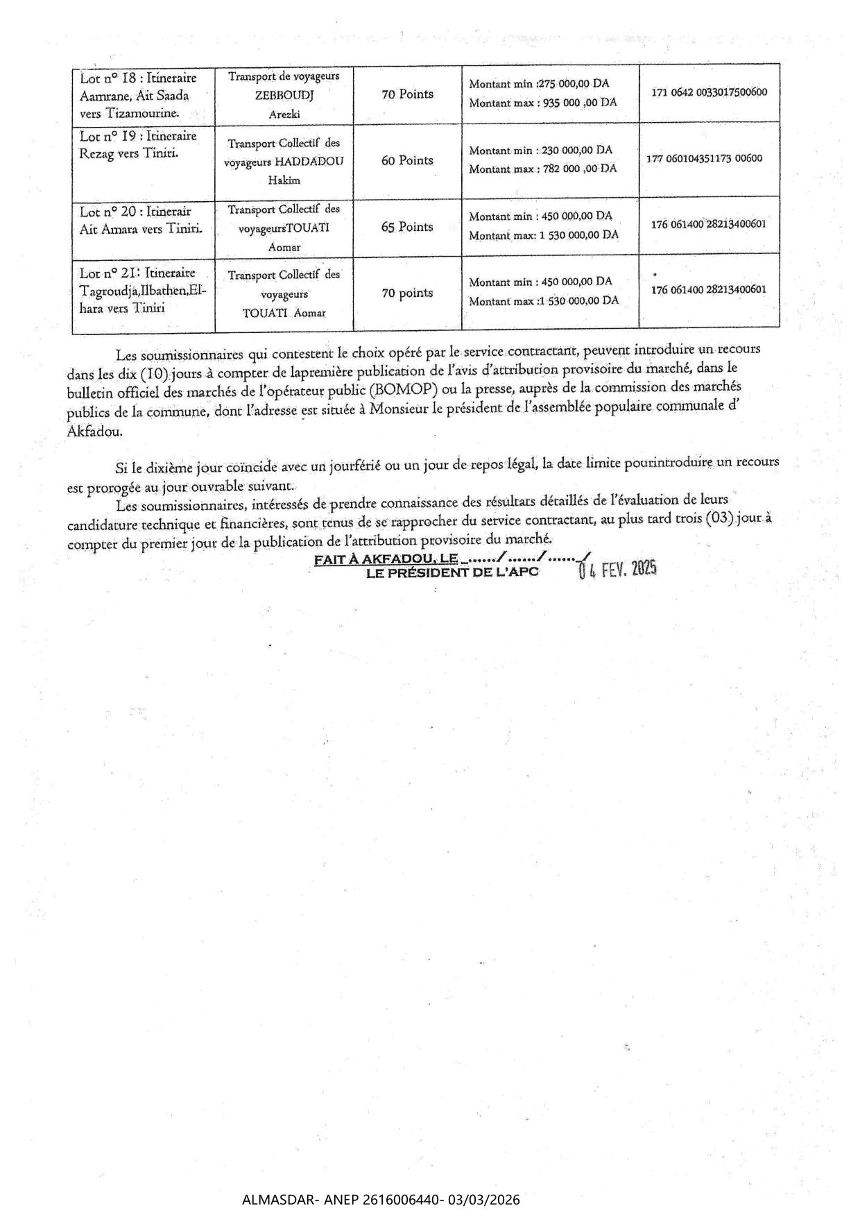 الزبون: COMMUNE D'AKFADOU WILAYA DE BEJAIA رقم ANEP 2616006440 تاريخ النشر: 2026-03-03 عدد الصفحات: 3/4