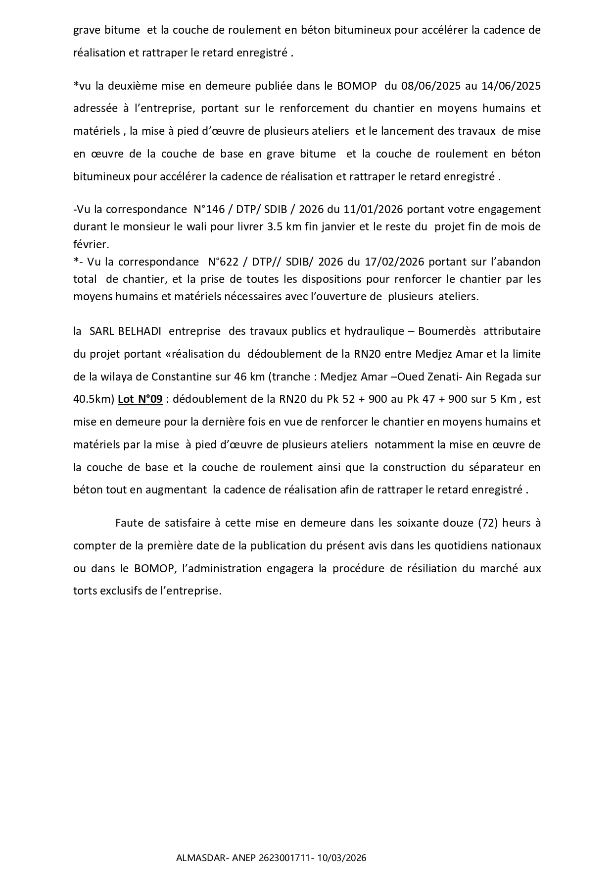 الزبون: DIRECTION DES TRAVAUX PUBLICS DE LA WILAYA DE GUELMA رقم ANEP 2623001711 تاريخ النشر: 2026-03-10 عدد الصفحات: 1/2