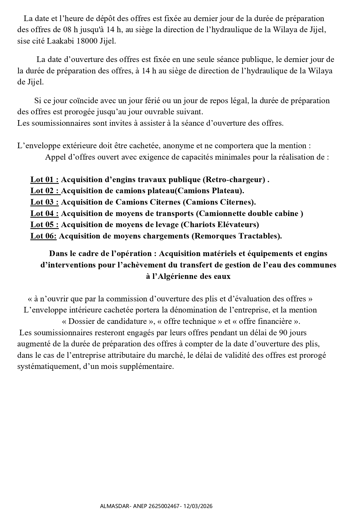الزبون: DIRECTION DE L’HYDRAULIQUE DE LA WILAYA DE JIJEL رقم ANEP 2625002467 تاريخ النشر: 2026-03-12 عدد الصفحات: 3/4