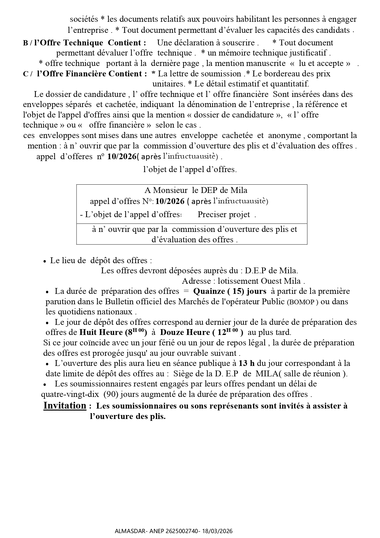 الزبون: DIRECTION DES EQUIPEMENT PUBLICS DE LA WILAYA DE MILA رقم ANEP 2625002740 تاريخ النشر: 2026-03-18 عدد الصفحات: 1/2