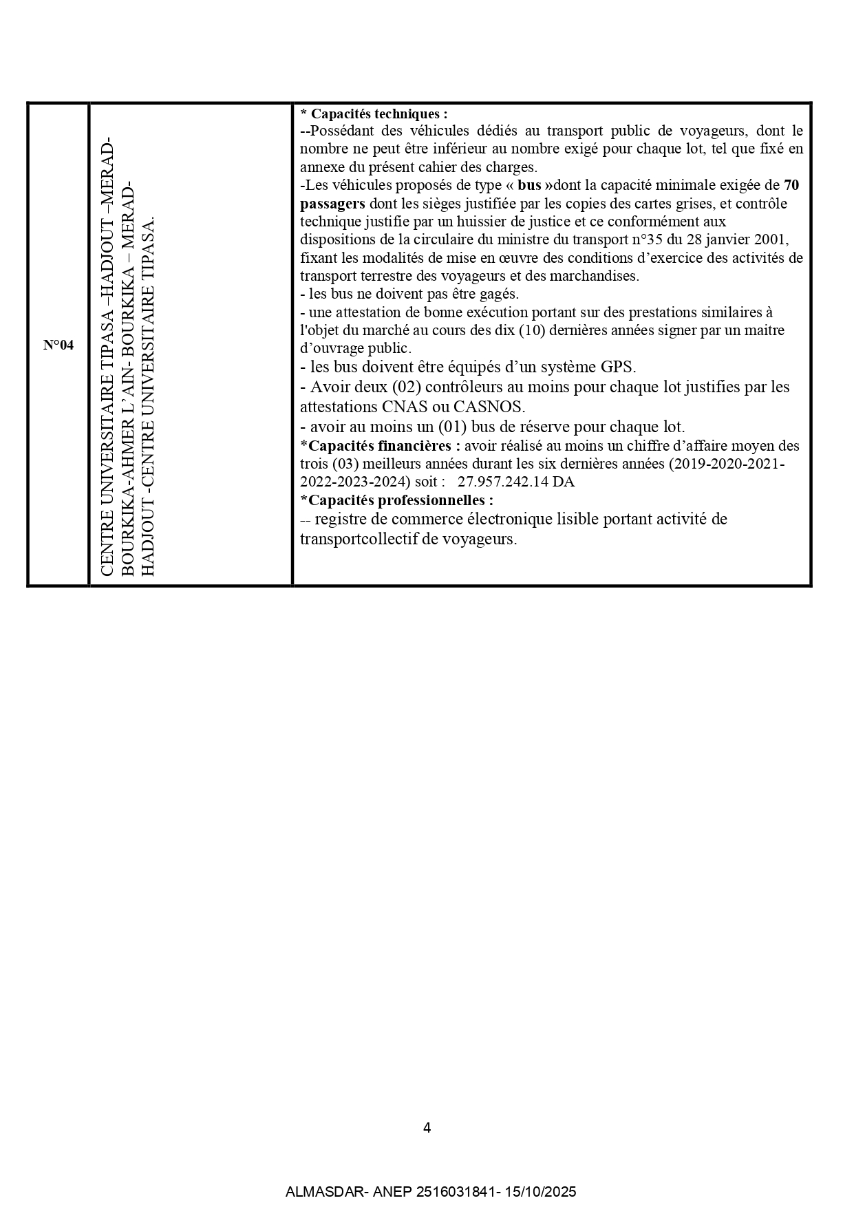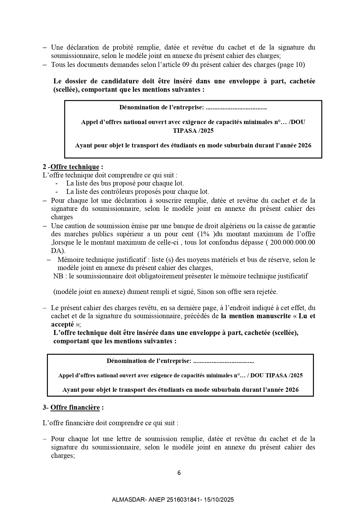 الزبون: office national de oeuvres universitaires رقم ANEP 2516031841 تاريخ النشر: 2025-10-15 عدد الصفحات: 1 - 3/4