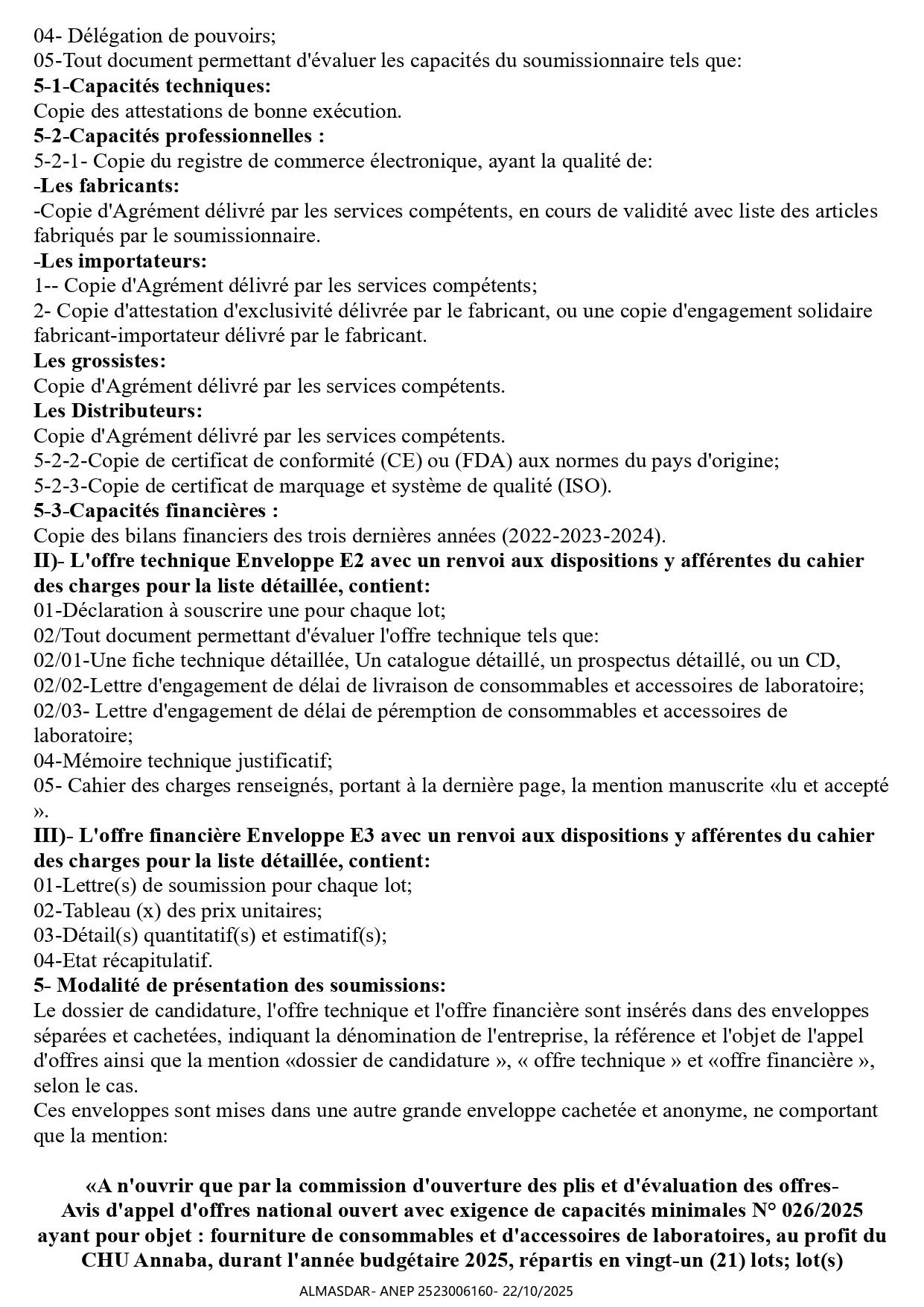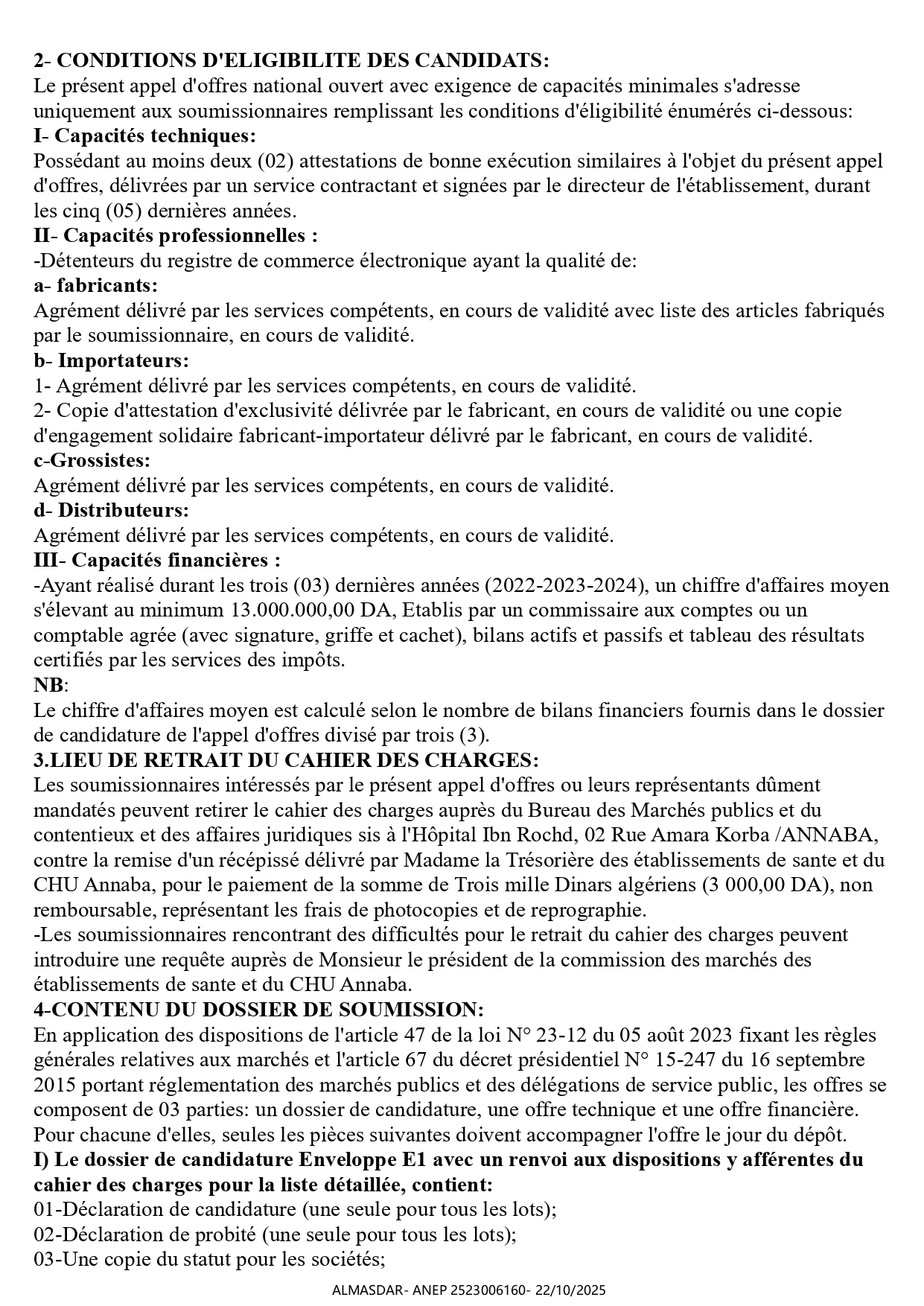 الزبون: CENTRE HOSPITALO-UNIVERSITAIRE D'ANNABA رقم ANEP 2523006160 تاريخ النشر: 2025-10-22 عدد الصفحات: 1