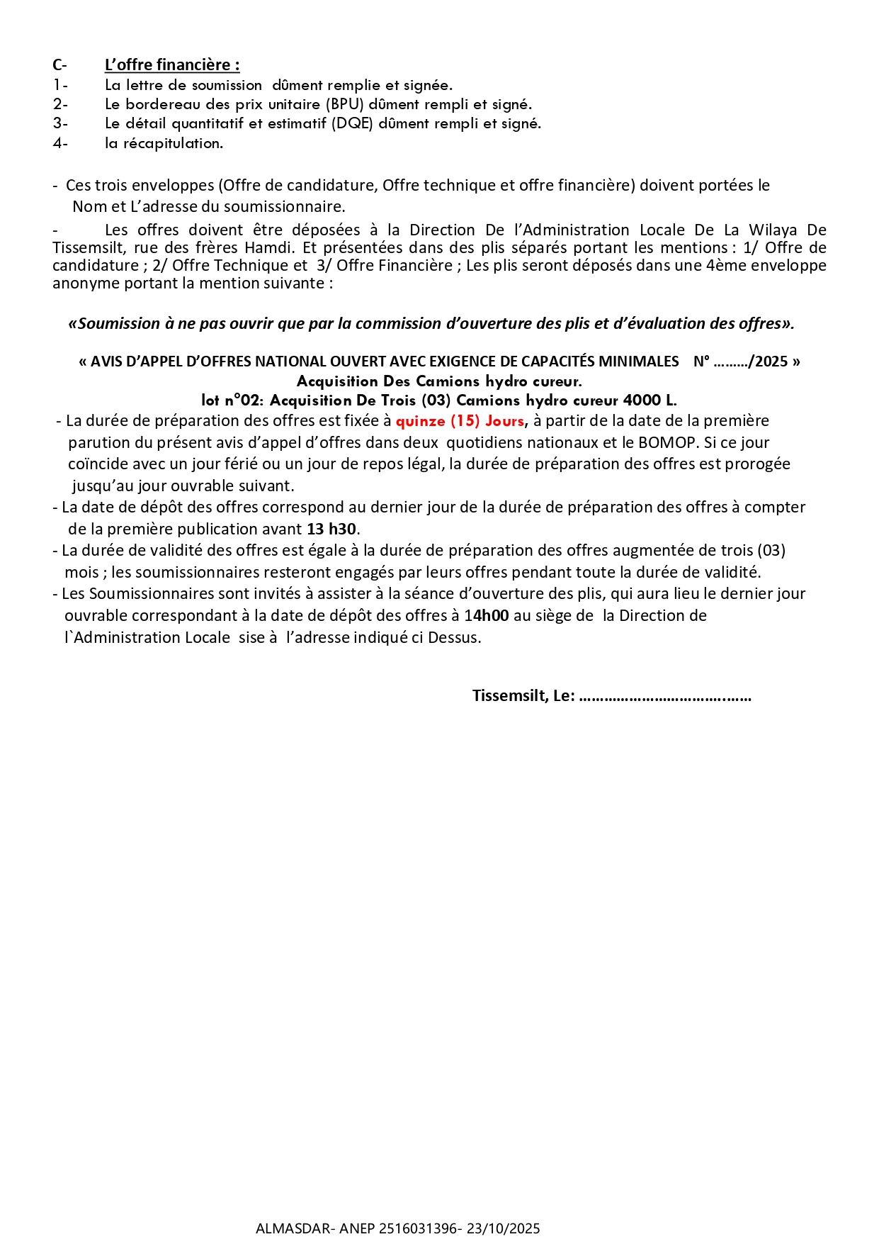 الزبون: WILAYA DE TISSEMSILT رقم ANEP 2516031396 تاريخ النشر: 2025-10-23 عدد الصفحات: 1/2