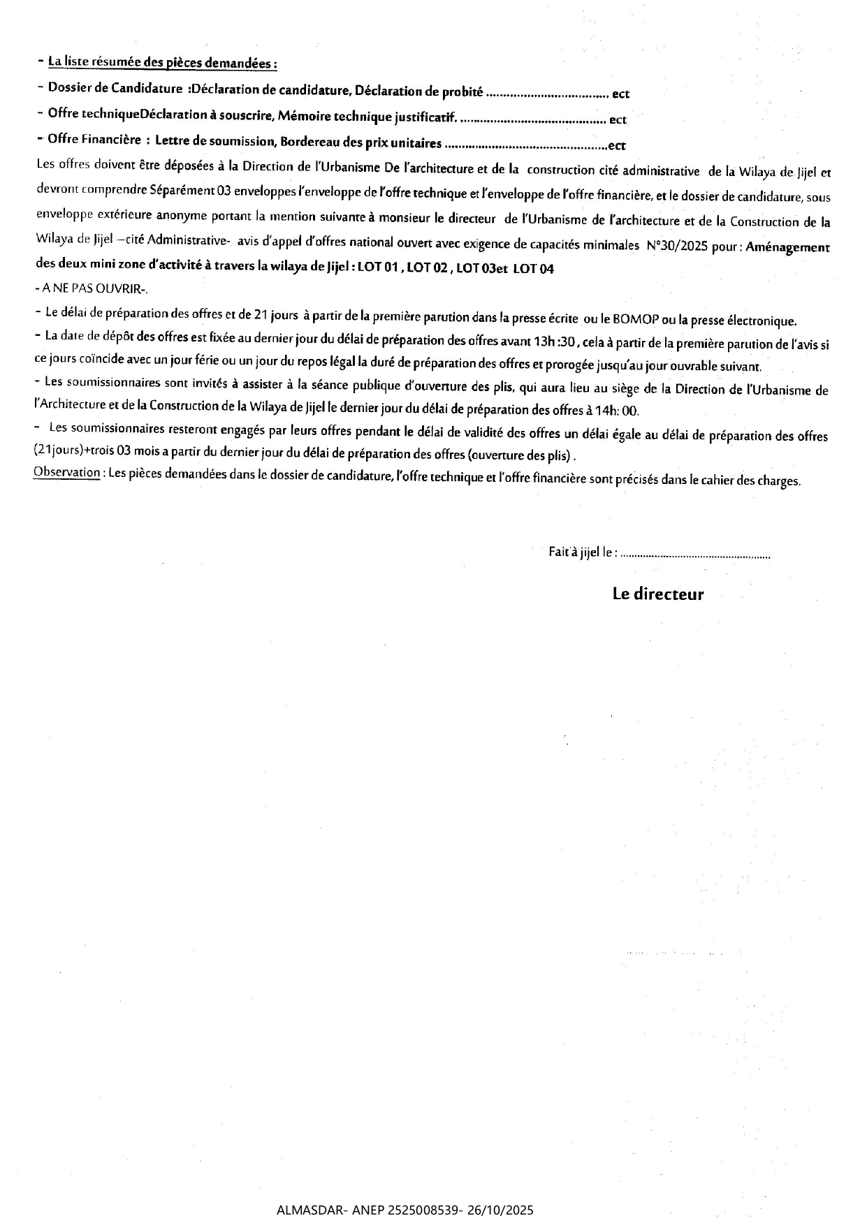 الزبون: DIRECTION DE L'URBANISME DE L44ARCHITECTURE ET DE LA CONSTRUCTION رقم ANEP 2525008539 تاريخ النشر: 2025-10-26 عدد الصفحات: 1/2