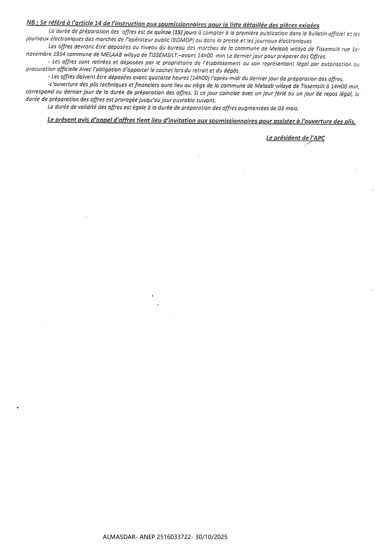 الزبون: commune de melaab wilaya de tissemsilt رقم ANEP 2516033722 تاريخ النشر: 2025-10-30 عدد الصفحات: 1/2
