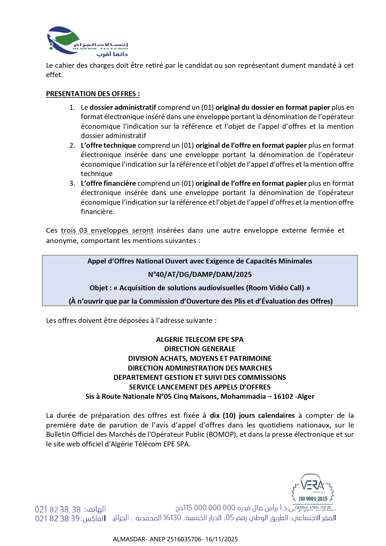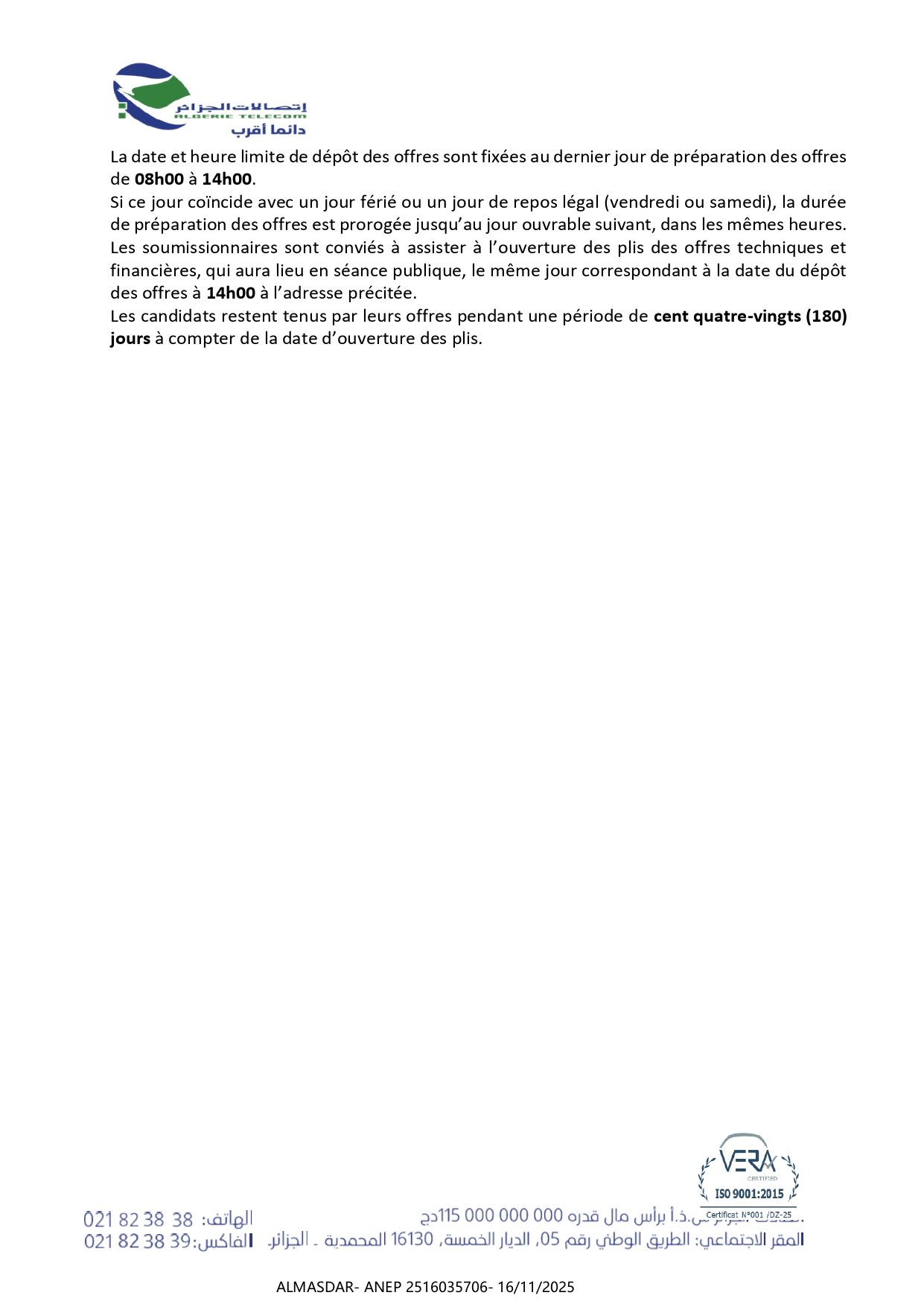الزبون: Direction Générale EPE - Algérie Télécom - SPA رقم ANEP 2516035706 تاريخ النشر: 2025-11-16 عدد الصفحات: 3/4