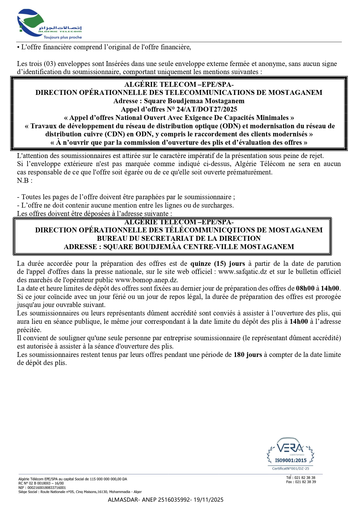 الزبون: DIRECTION OPERATIONNELLE DES TELECOMMUNICATIONS DE MOSTAGANEM رقم ANEP 2516035992 تاريخ النشر: 2025-11-19 عدد الصفحات: 1/2