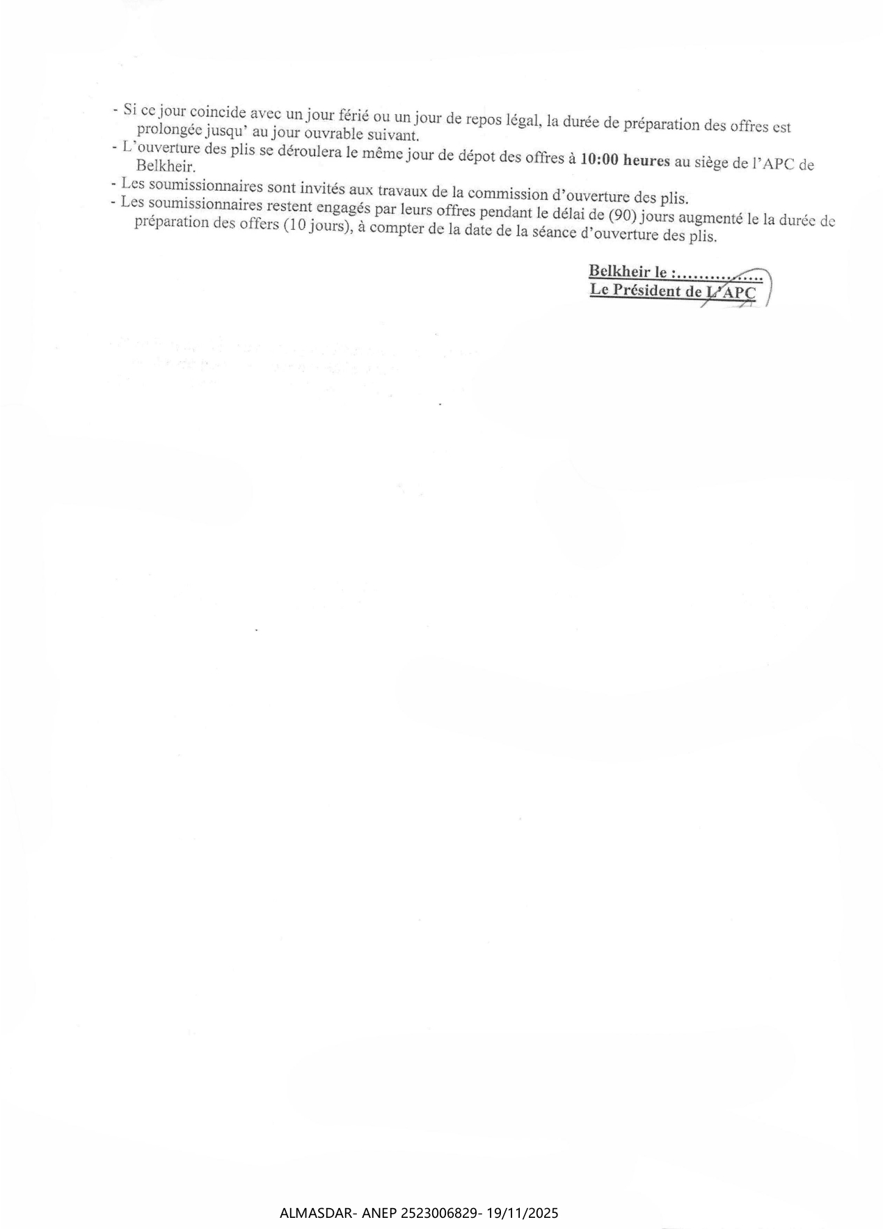 الزبون: COMMUNE DE BELKHIER WILAYA DE GUELMA رقم ANEP 2523006829 تاريخ النشر: 2025-11-19 عدد الصفحات: 1/2
