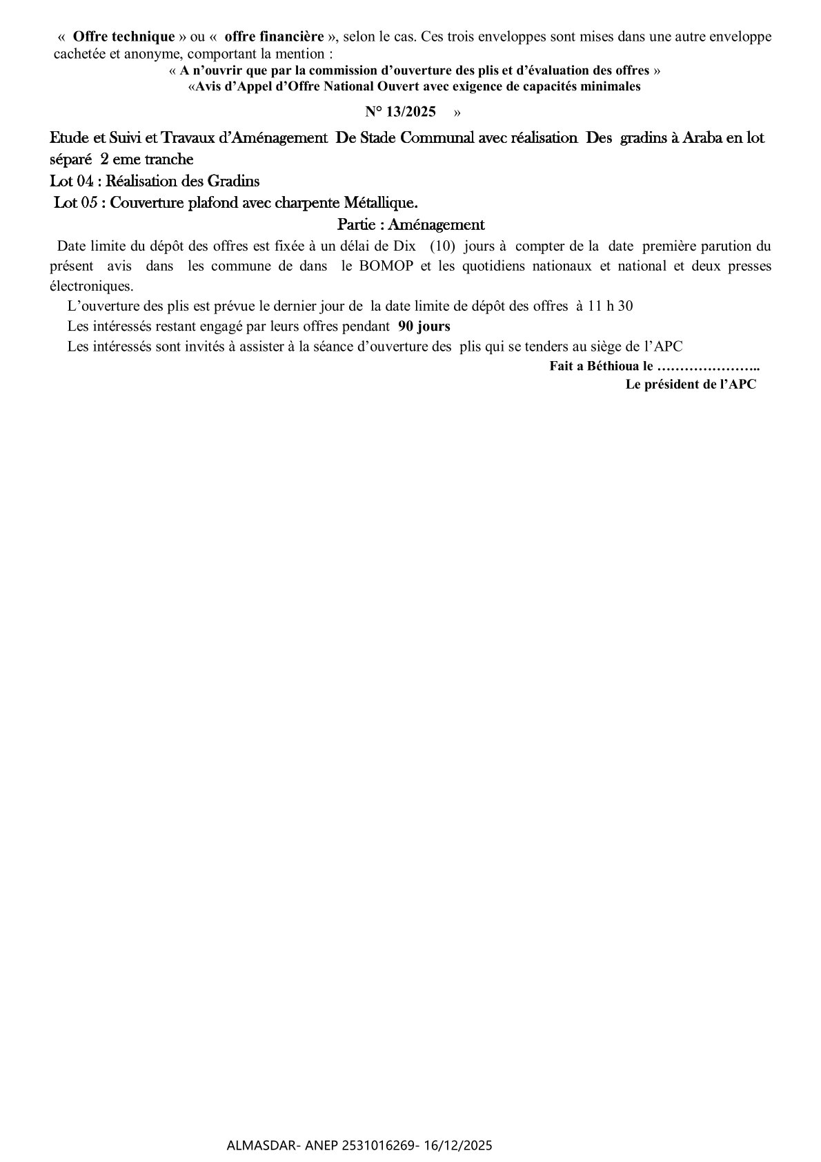 الزبون: DAIRA DE BETHIOUA COMMUNE DE BETHIOUA رقم ANEP 2531016269 تاريخ النشر: 2025-12-16 عدد الصفحات: 1/2