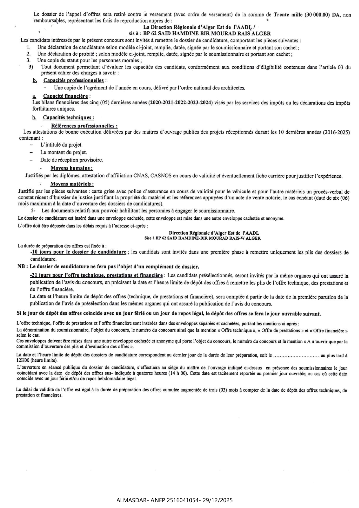 الزبون: DIRECTION GENERALE AADL ALGER EST رقم ANEP 2516041054 تاريخ النشر: 2025-12-29 عدد الصفحات: 1/2