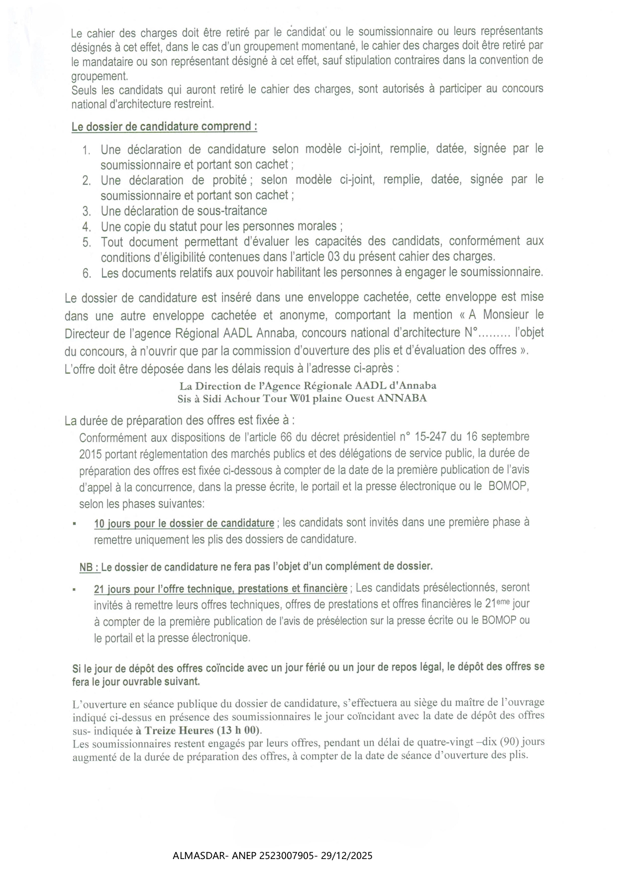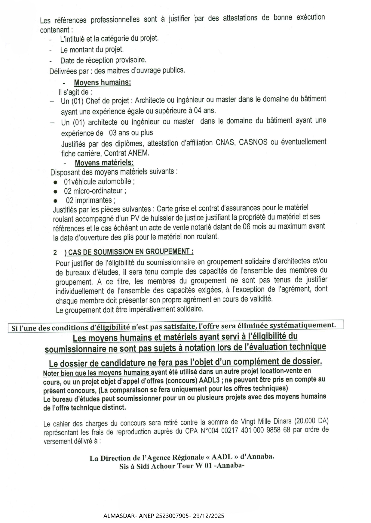 الزبون: aadl annaba رقم ANEP 2523007905 تاريخ النشر: 2025-12-29 عدد الصفحات: 3/4