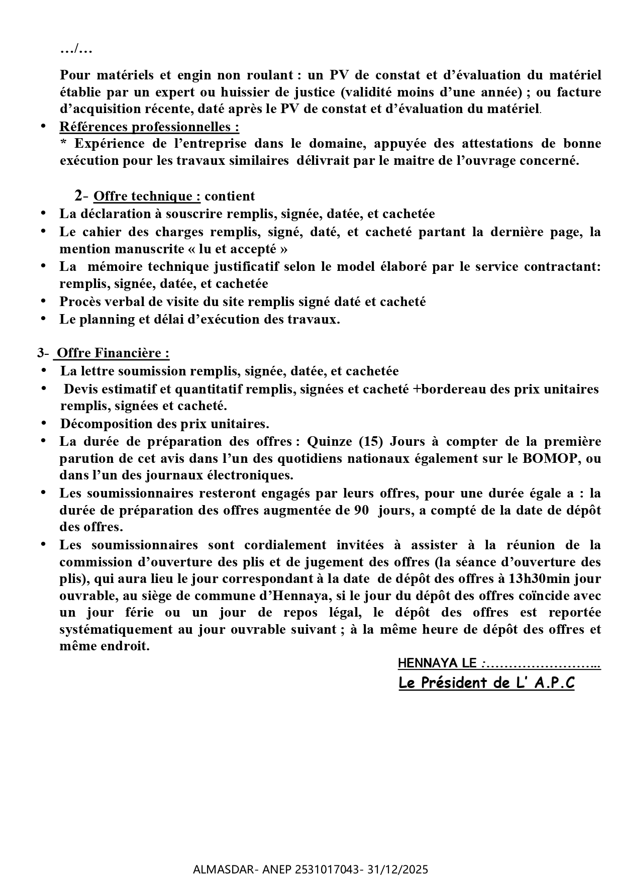 الزبون: W WILAYA DE TLEMCEN D DD CC DAIRA D’HENNAYA C COMMUNE D’HEN رقم ANEP 2531017043 تاريخ النشر: 2025-12-31 عدد الصفحات: 1/2