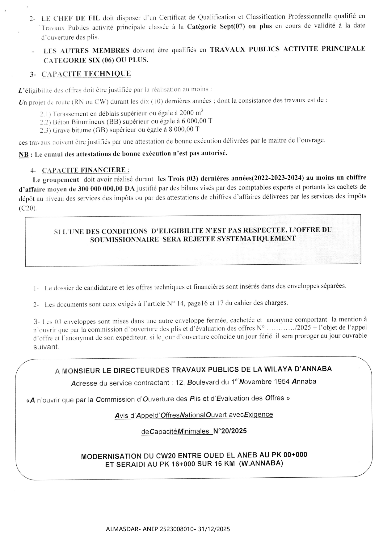 الزبون: wilaya de annaba رقم ANEP 2523008010 تاريخ النشر: 2025-12-31 عدد الصفحات: 3/4
