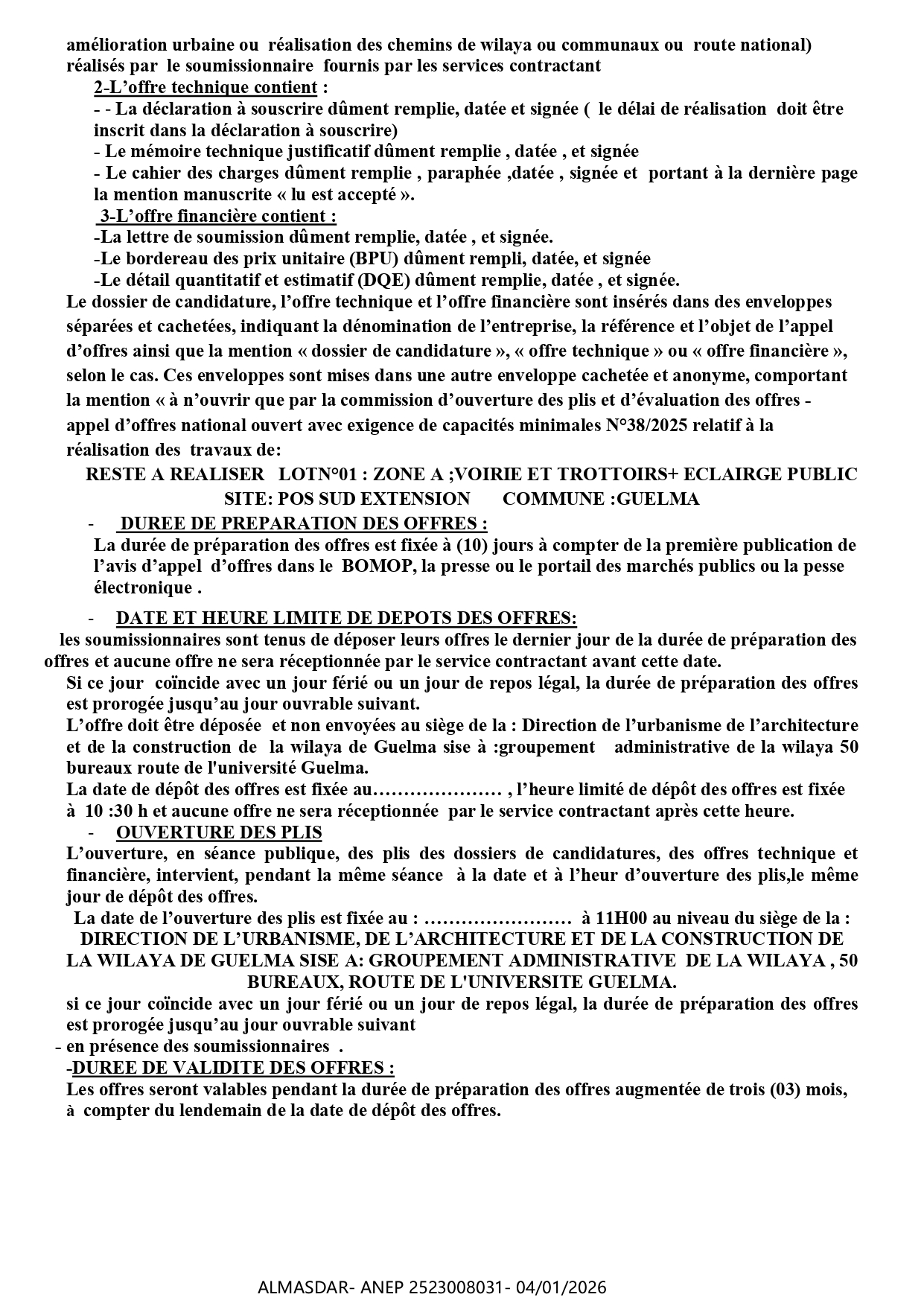 الزبون: DIRECTION DE L’URBANISME, DE L’ARCHITECTURE ET DE LA CONSTRUCTION DE LA WILAYA DE GUELMA رقم ANEP 2523008031 تاريخ النشر: 2026-01-04 عدد الصفحات: 1/2