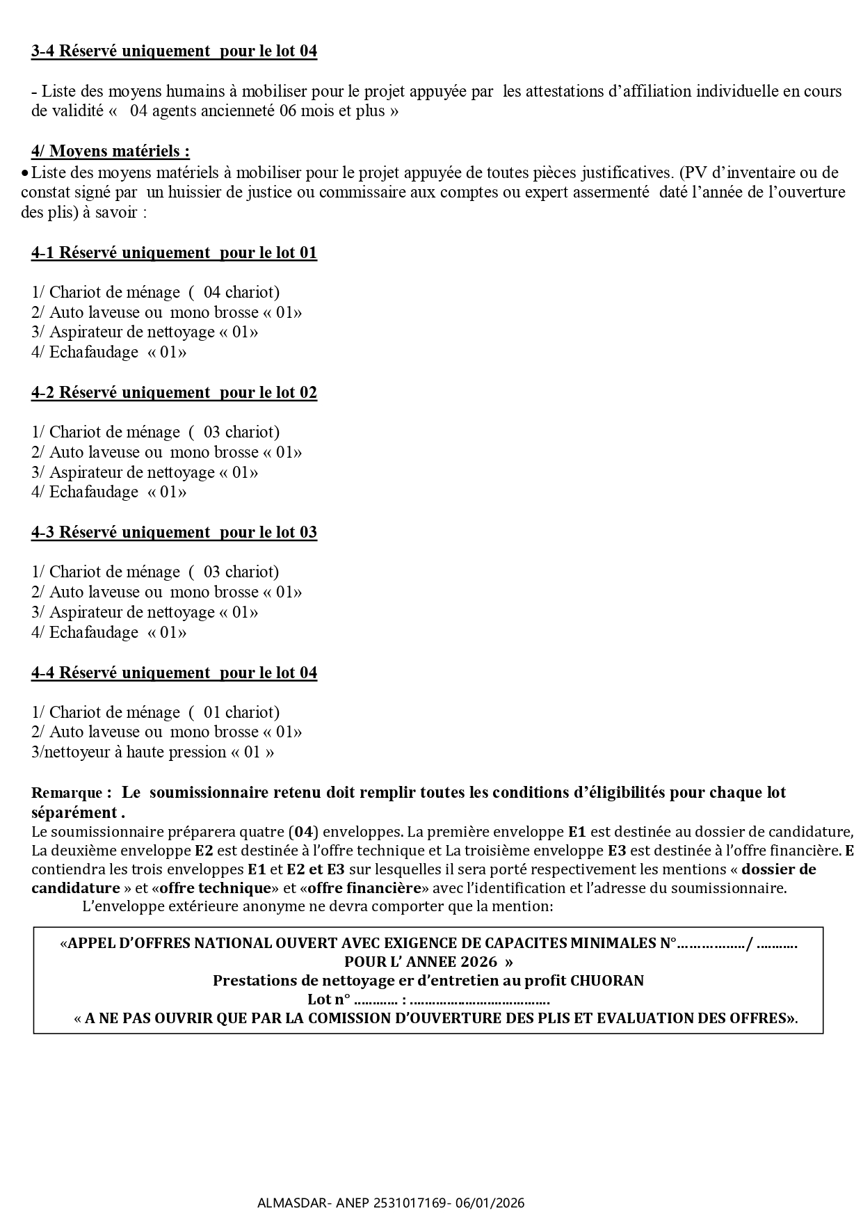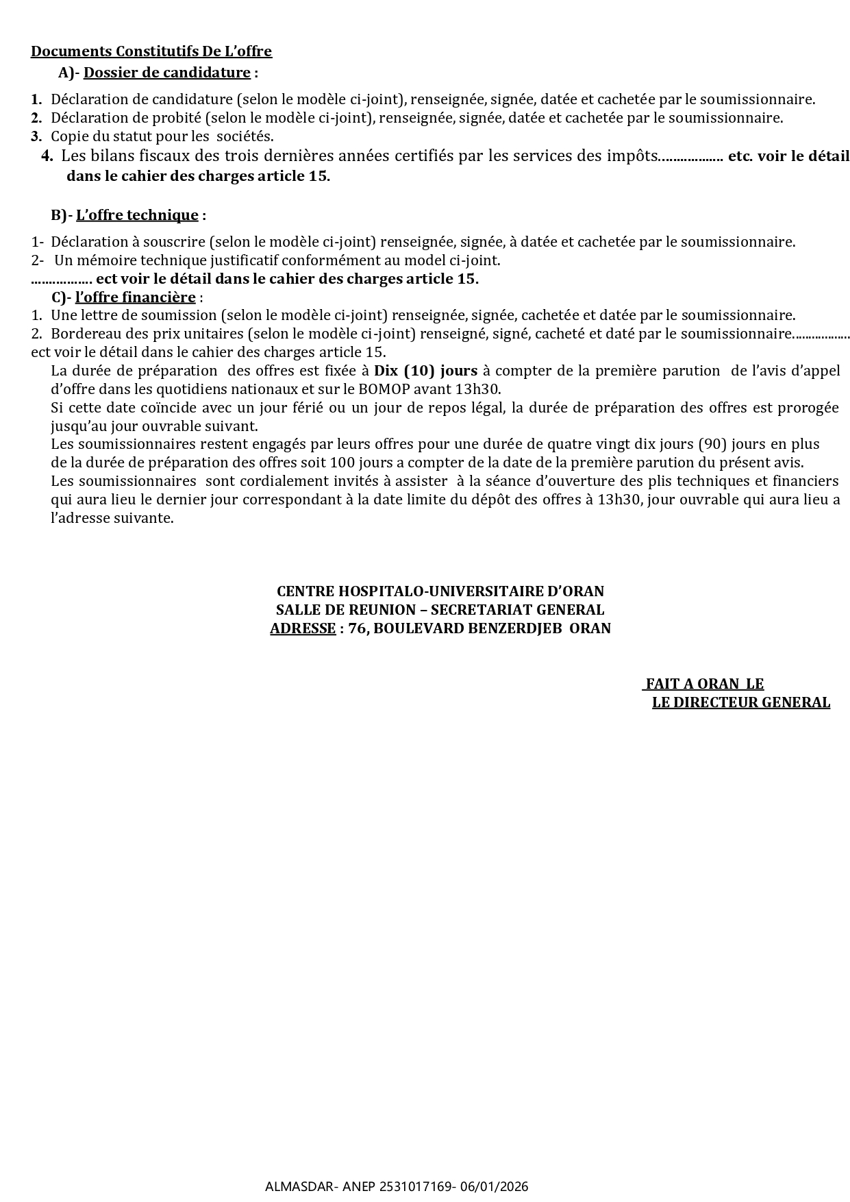 الزبون: CENTRE HOSPITALO – UNIVERSITAIRE D’ORAN رقم ANEP 2531017169 تاريخ النشر: 2026-01-06 عدد الصفحات: 3/4